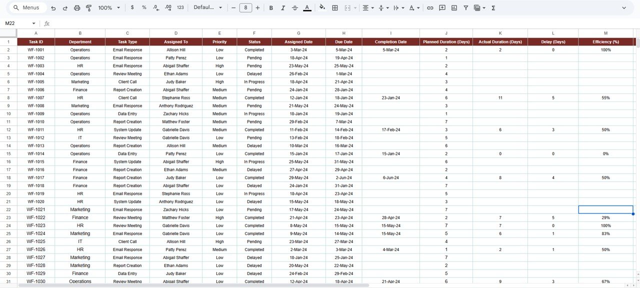 Fields include Task ID, Task Name, Department, Assigned To, Priority, Status, Start & Due Dates, Completion %, and Efficiency metrics.
