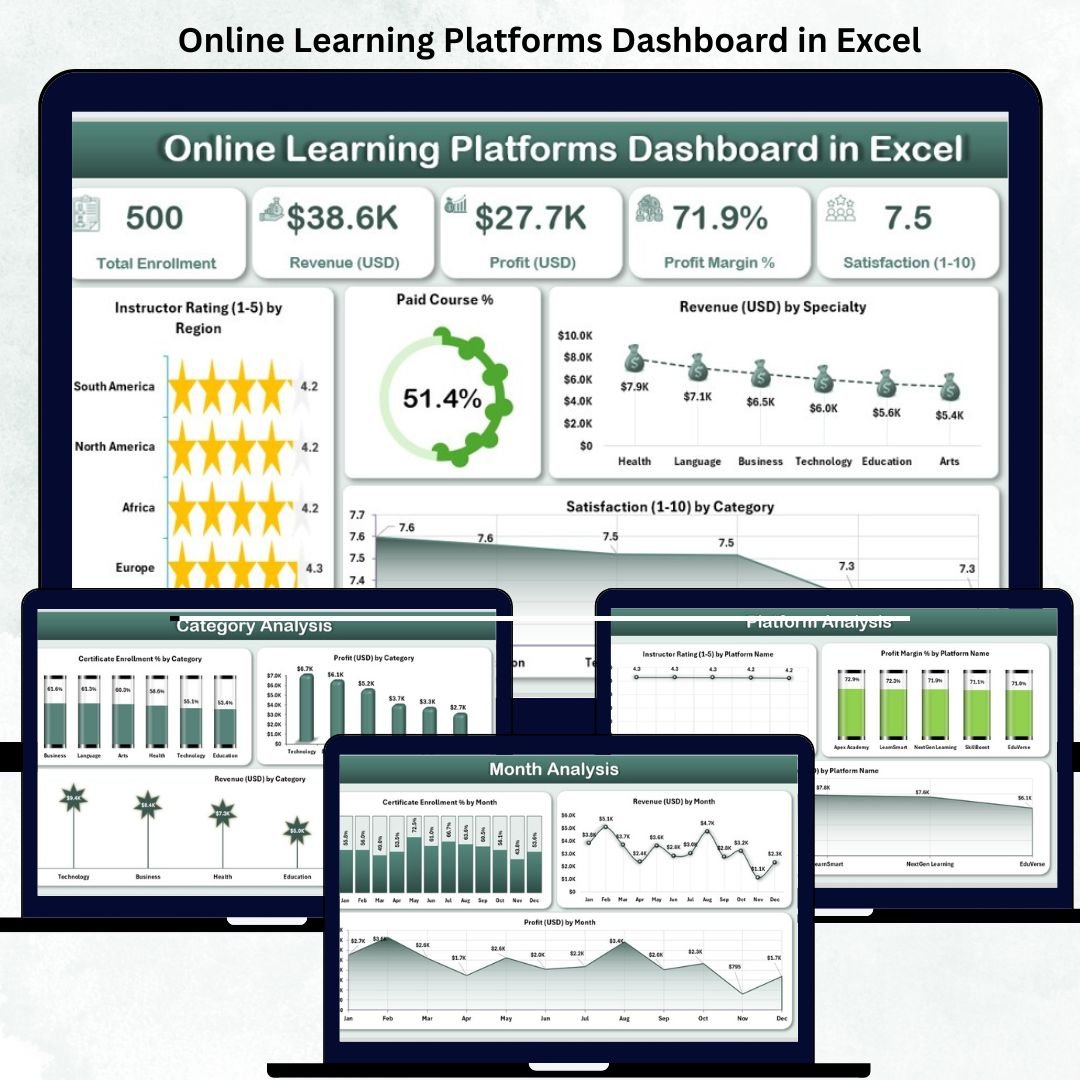 The Online Learning Platforms Dashboard in Excel is more than a spreadsheet — it’s a strategic analytics hub for your e-learning business.