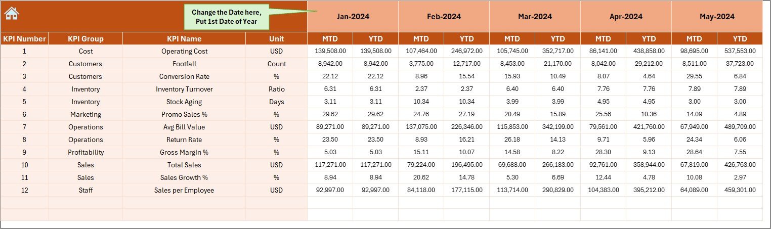 📊 Dashboard Sheet – Displays all KPIs with MTD, YTD, Target, and Previous Year comparisons.