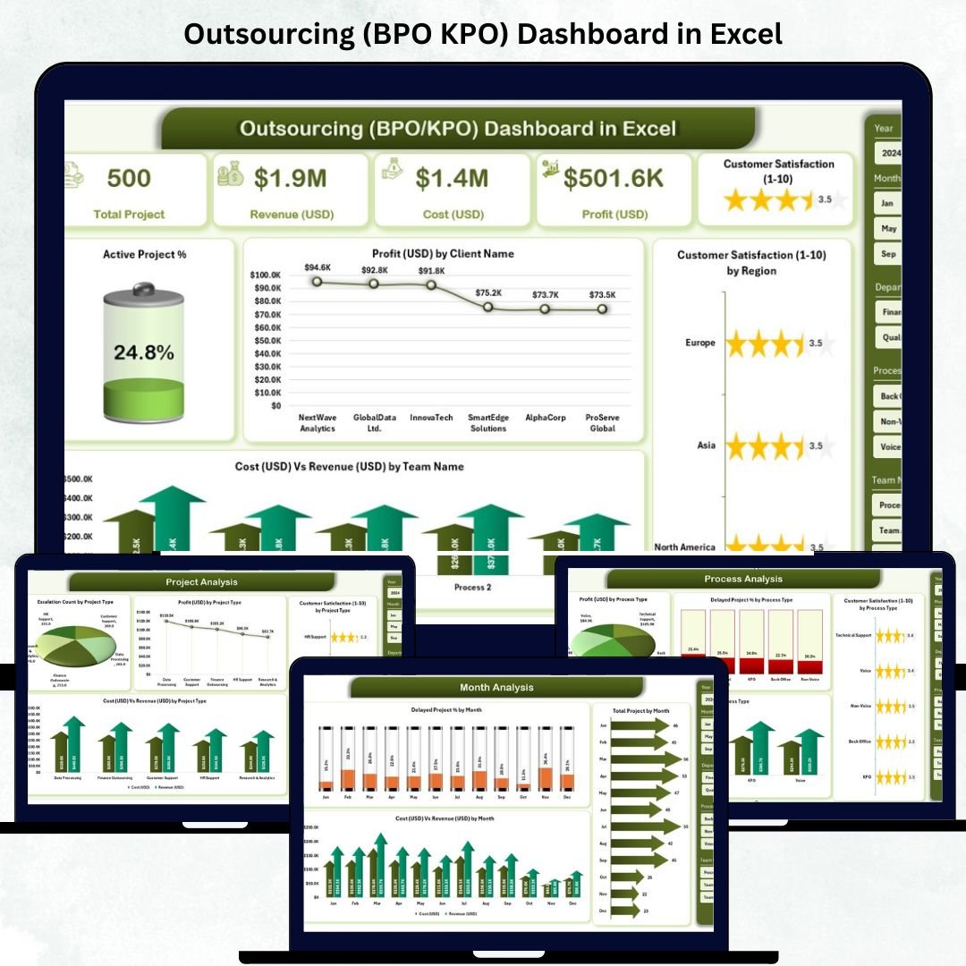 In today’s outsourcing world, success depends on efficiency, client satisfaction, and profitability. This ready-to-use Excel dashboard empowers managers and executives to track costs, monitor project delays, measure satisfaction, and optimize resources — without any coding or complex BI tools.