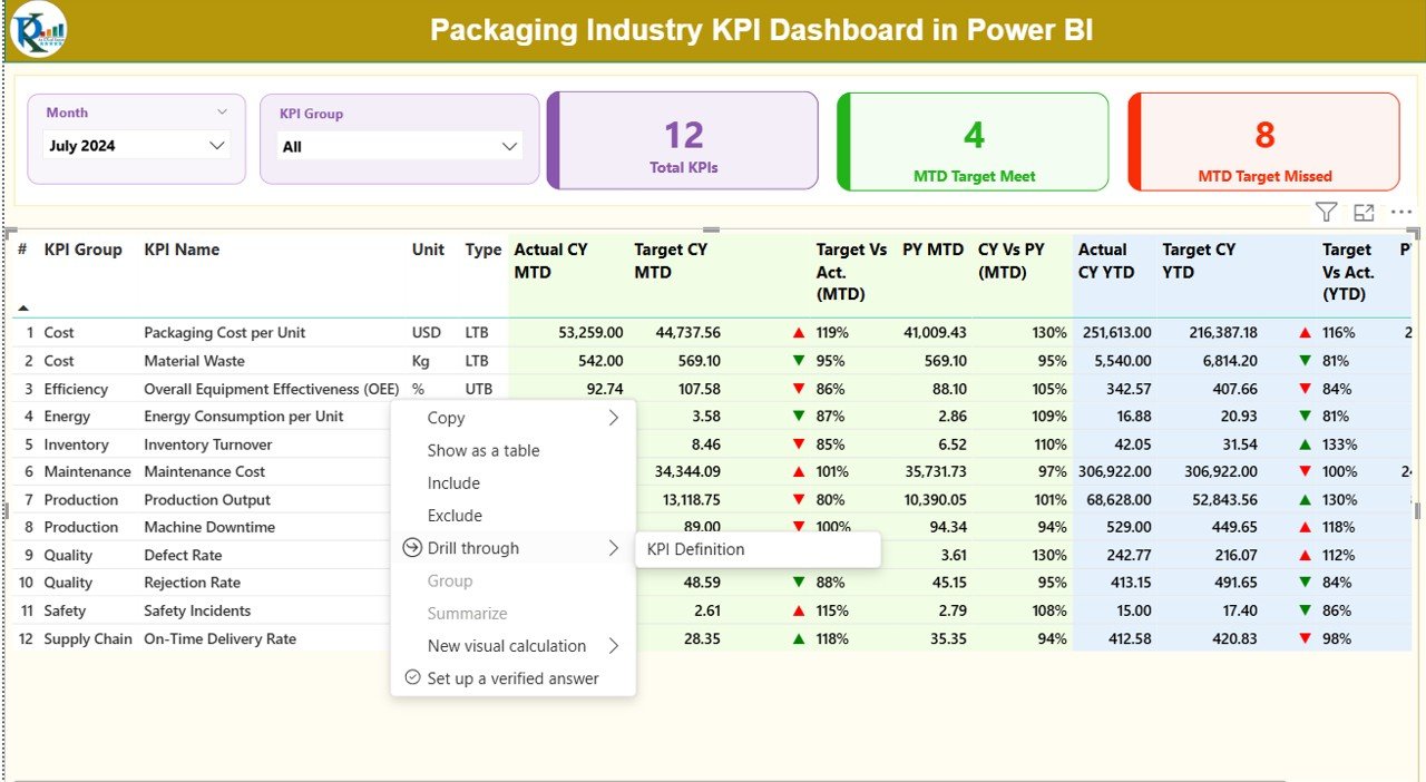 📂 What’s Inside the Packaging Industry KPI Dashboard in Power BI