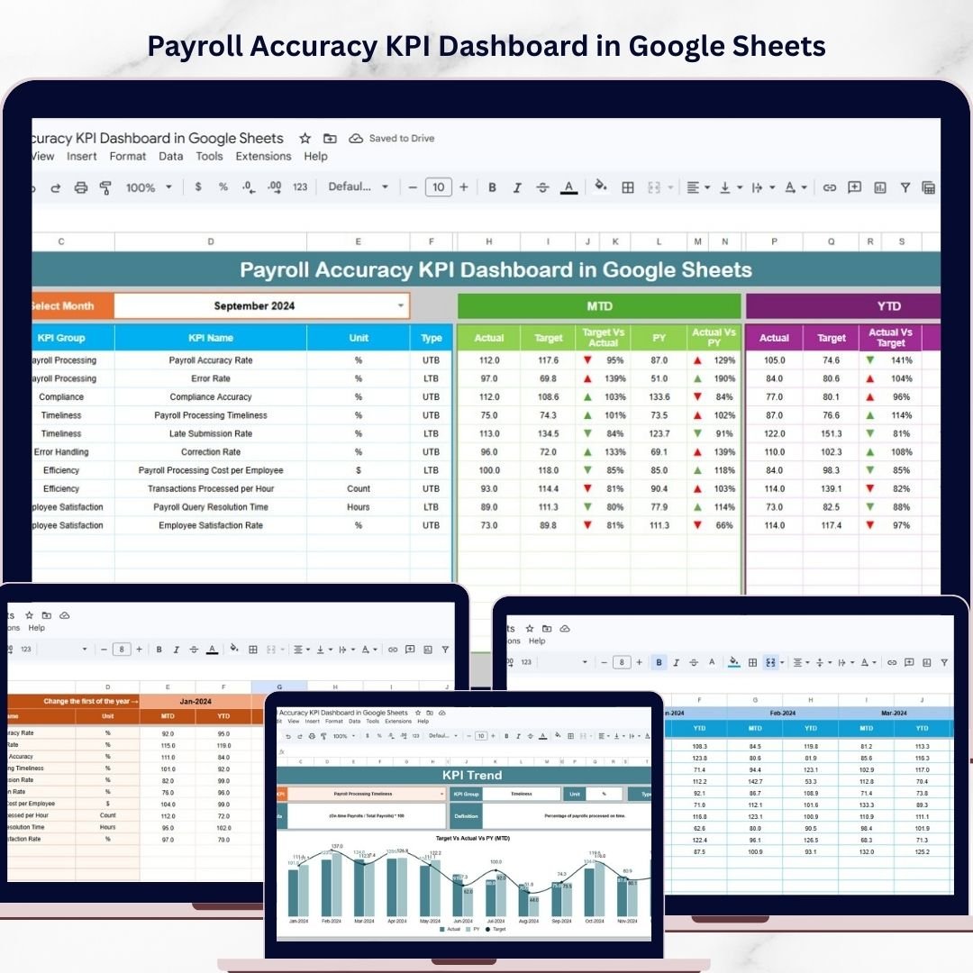 To solve this challenge, we created the Payroll Accuracy KPI Dashboard in Google Sheets — a powerful, ready-to-use analytics tool designed to help organizations monitor payroll performance with clarity and precision.