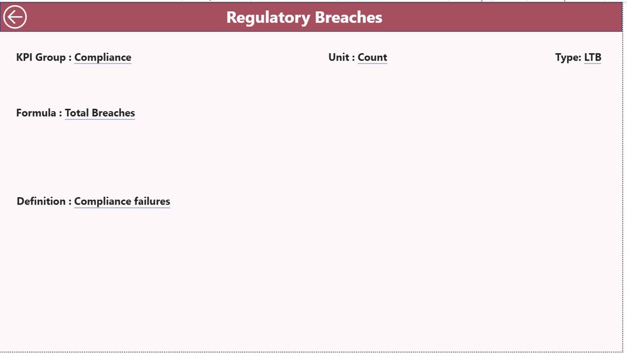 A drill-through governance page that stores KPI formulas, definitions, units, groups, and types (LTB / UTB). This ensures consistent understanding across teams and supports audits and compliance.