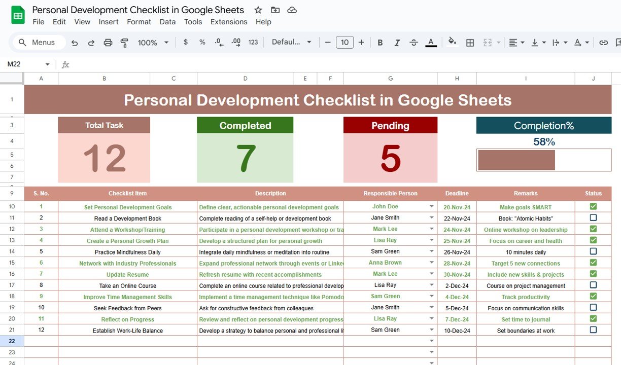 By using the Personal Development Checklist in Google Sheets, you can take control of your growth, track your progress effectively, and make consistent strides toward personal development.
