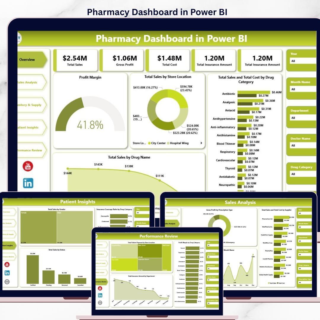 The Pharmacy Dashboard in Power BI tracks 4 headline financial KPIs — Total Sales, Gross Profit, Total Cost, and Total Insurance Amount — plus 14+ operational visuals across Sales Analysis, Inventory & Supply, Patient Insights, and Performance Review pages. Every metric updates automatically when you replace the sample data.