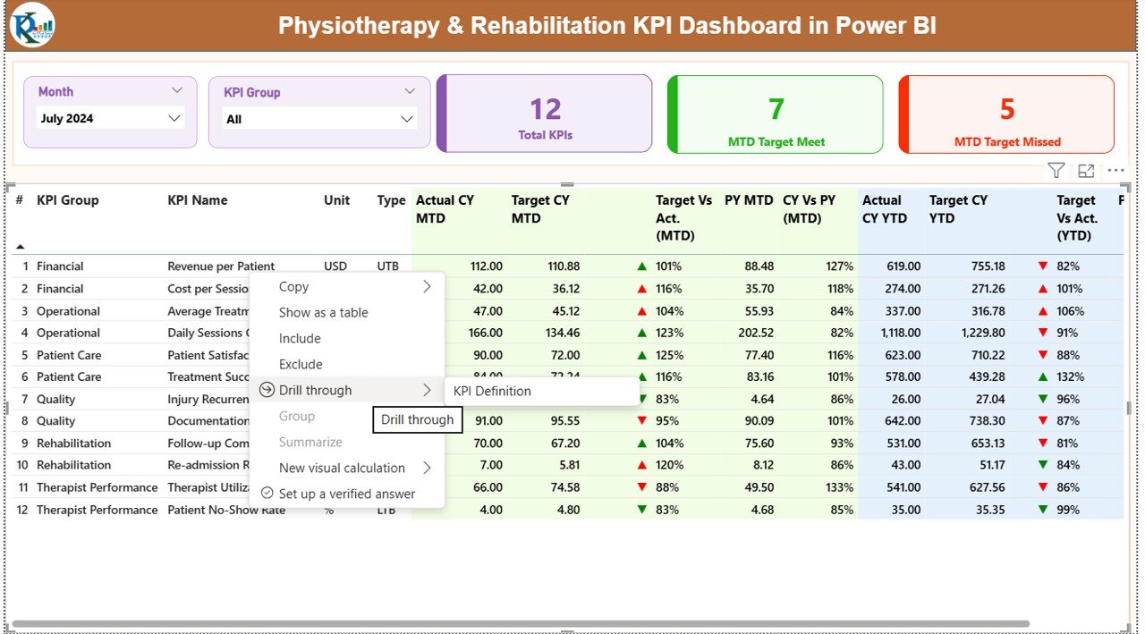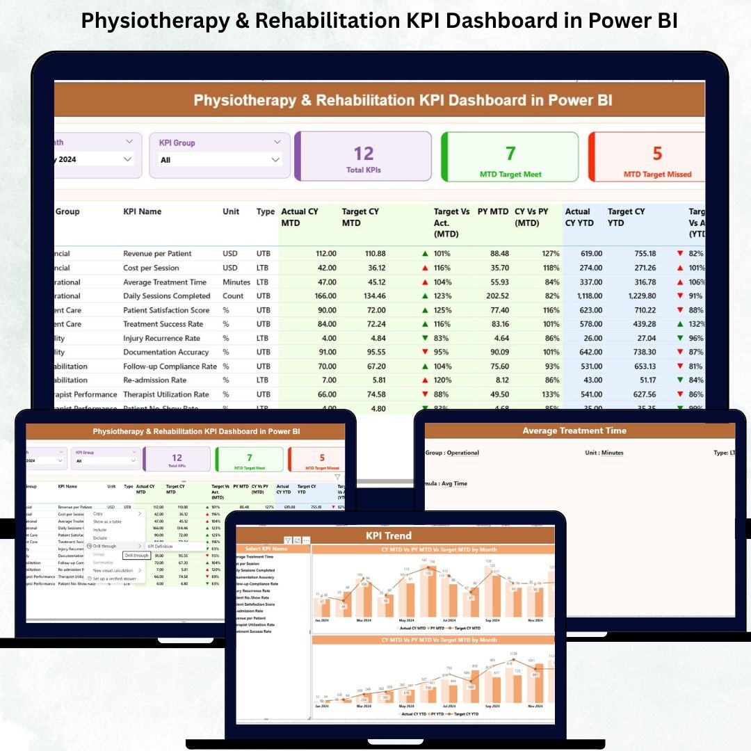 You can also drill-through KPIs to see full definitions, compare trends, or use slicers to analyze patient, therapist, financial, or operational KPIs.Physiotherapy & Rehabilitation KPI Dashboard in Power BI