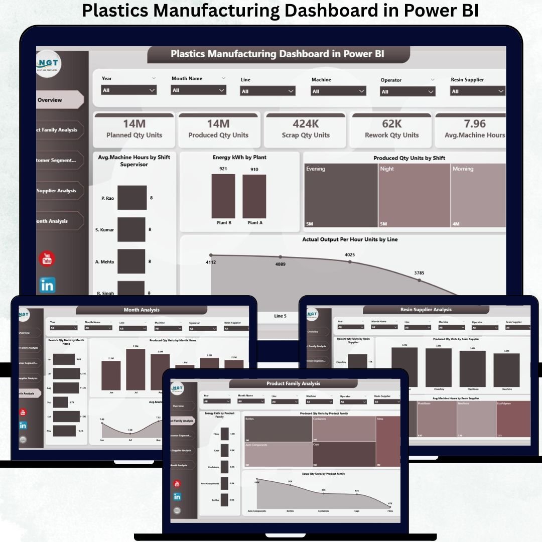 The Plastics Manufacturing Dashboard in Power BI is a ready-to-use, interactive analytics dashboard designed to monitor and improve manufacturing performance across product families, customer segments, resin suppliers, machines, and time periods.