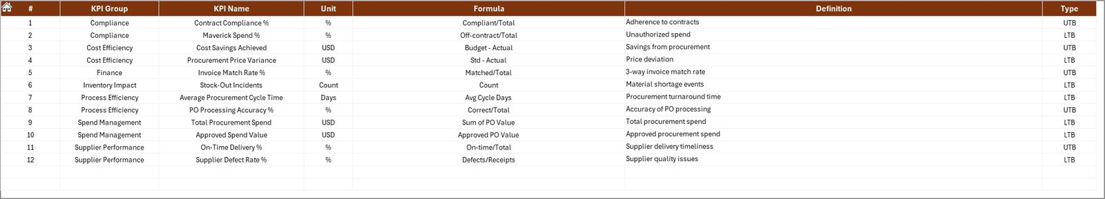 📌 Dashboard Sheet – Displays all procurement KPIs with MTD, YTD, targets, and comparisons