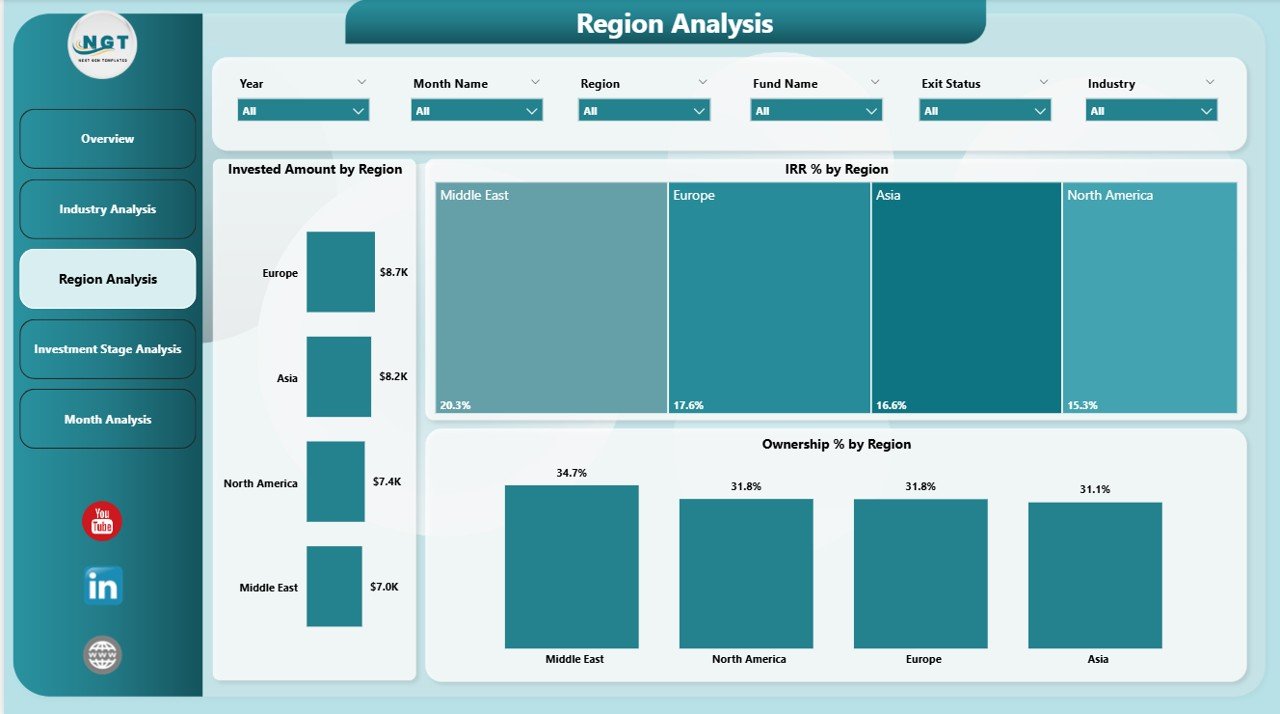 The Region Analysis Page provides a clear view of geographic exposure and returns.