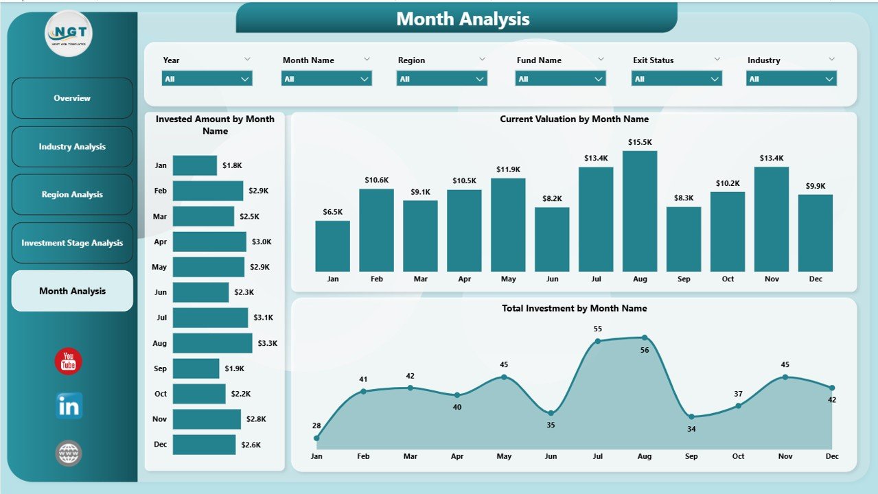 The Month Analysis Page tracks investment activity and valuation trends over time.