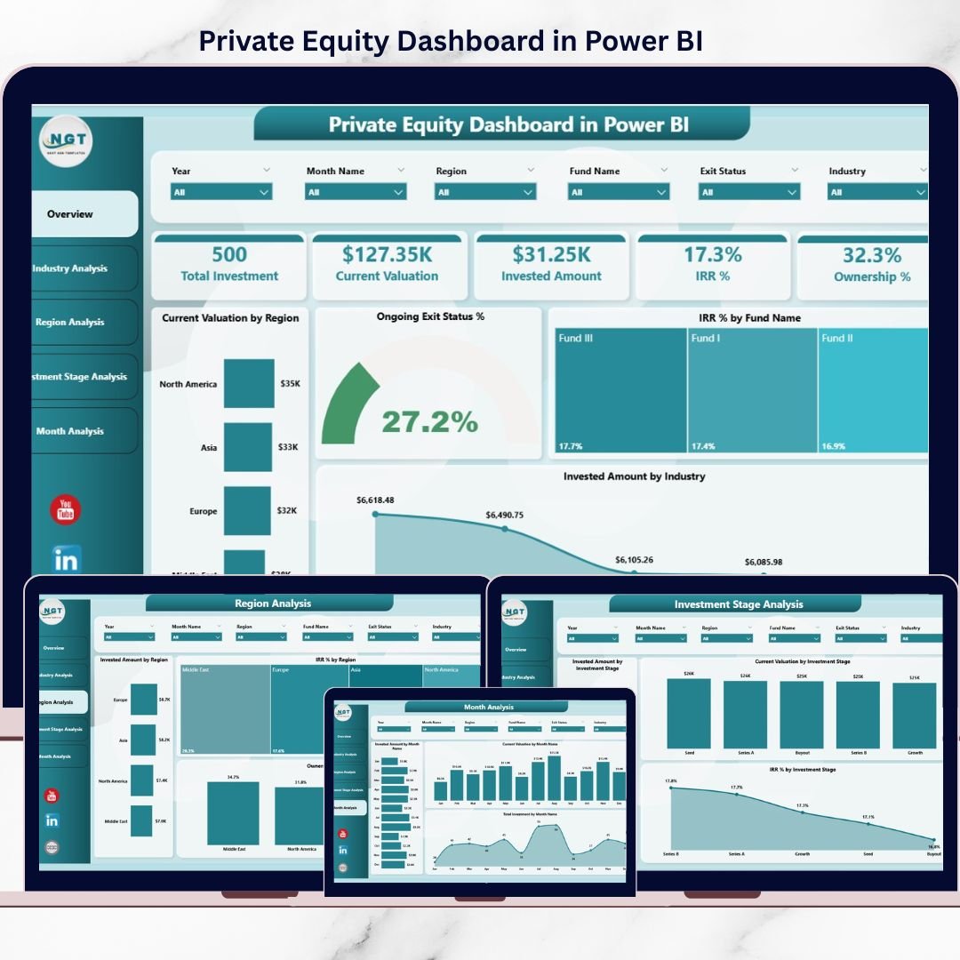 This ready-to-use Power BI dashboard transforms complex private equity data into interactive, visual, and decision-ready insights. It helps firms track valuation, invested capital, IRR, ownership, exit status, and trends across funds, industries, regions, investment stages, and time periods—all in one centralized dashboard.