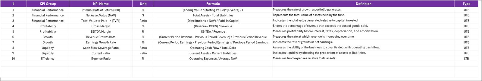 Centralized Fund Visibility – View all KPIs across portfolios and funds in one file.