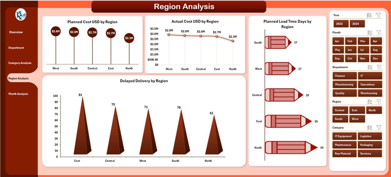 Procurement leaders compare regional performance and detect logistics or supplier issues specific to locations.