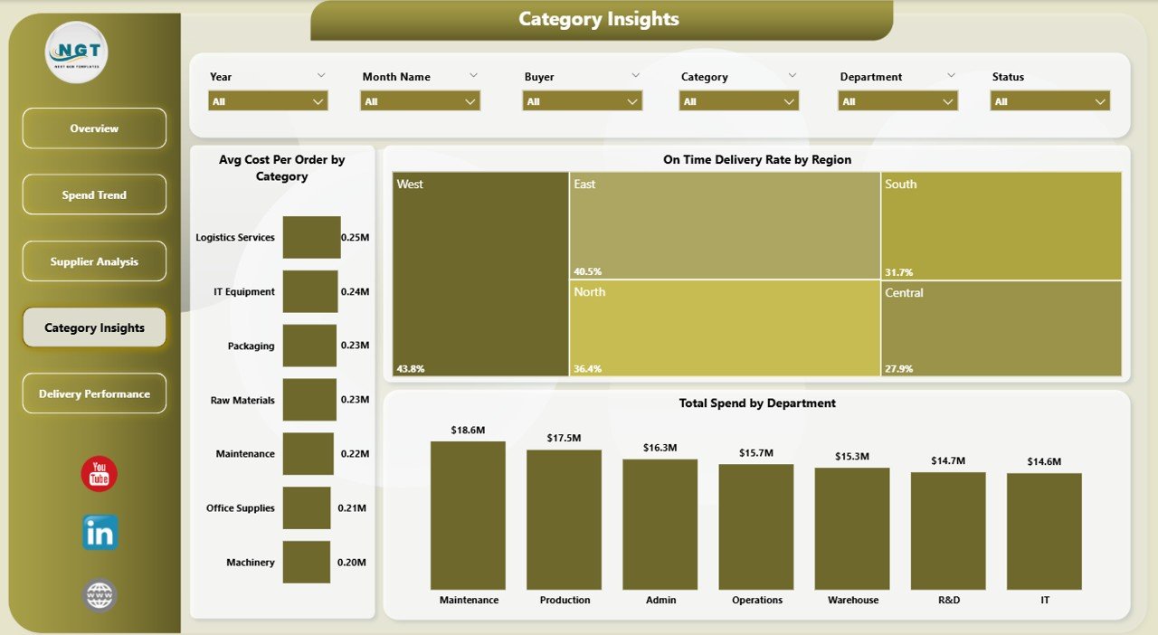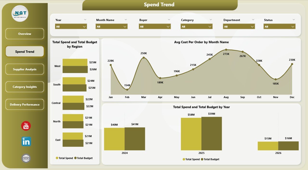 📊 5 Interactive Dashboard Pages — The template delivers complete procurement visibility across Overview, Spend Trend, Supplier Analysis, Category Insights, and Delivery Performance pages. Each page is packed with dynamic charts and slicers for instant filtering by region, category, supplier, status, and time period.