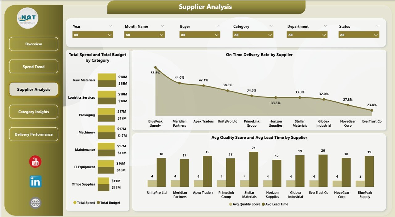 The Supplier Analysis page tracks Total Spend and Total Budget by Category, On Time Delivery Rate by Supplier, and Avg Quality Score and Avg Lead Time by Supplier. These metrics help procurement teams make data-driven decisions about vendor selection and contract negotiations.