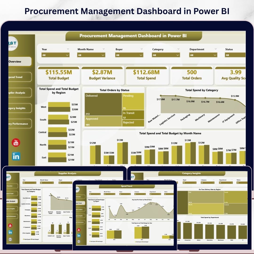 Procurement Management Dashboard in Power BI is a professional, ready-to-use Power BI dashboard template designed for procurement managers, supply chain directors, and operations teams who need to monitor procurement spending, supplier performance, order fulfillment, budget compliance, and delivery efficiency — all from one powerful and interactive Power BI Dashboard. This template includes 5 interactive dashboard pages and tracks 5 key performance indicators including Total Budget, Budget Variance, Total Spend, Total Orders, and Avg Quality Score.