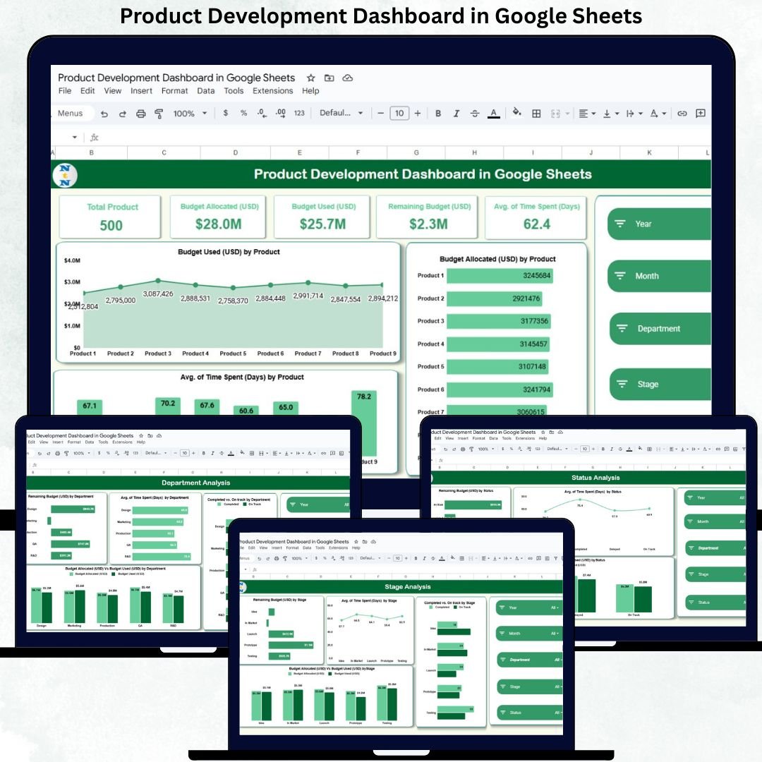 In today’s fast-moving business world, product development teams must work faster, smarter, and more collaboratively. New ideas emerge constantly, customer expectations change quickly, and teams must juggle multiple priorities at once. Without a clear system to track budget, timelines, department performance, and progress across stages, organizations face delays, overspending, and missed opportunities. The Product Development Dashboard in Google Sheets solves this challenge with a powerful, structured, and easy-to-use monitoring solution.