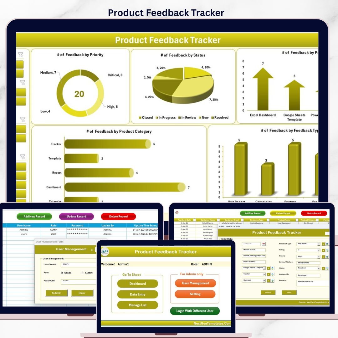 The Product Feedback Tracker in Excel captures structured customer and user feedback across 8 purpose-built worksheets, with a password-protected Login Form, a VBA-powered Data Entry form (Add / Update / Delete), a Dashboard page with 4 slicers and 5 auto-refreshing charts, plus a dedicated User Management sheet. Replace the sample feedback records and every KPI, chart, and filter updates in under 10 minutes.