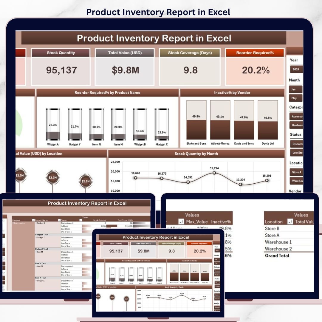 The Product Inventory Report in Excel tracks 5 core KPIs across 4 structured sheets, with 5 interactive charts covering Active %, Reorder Required %, Inactive %, Total Value by Location, and Stock Quality by Month. Setup takes under 10 minutes — paste your SKU-level data into the Data sheet, click Refresh All, and every card, chart, and slicer on the Summary Page rebuilds automatically through pivot tables.