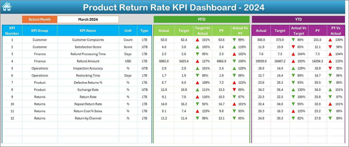 ✅ Conditional Formatting – Color-coded arrows highlight performance gaps.Product Return Rate KPI Dashboard in Excel