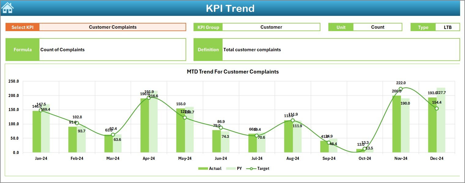 ✅ 7 Ready-to-Use Sheets – Home, Dashboard, KPI Trend, Actual Numbers, Targets, Previous Year Data, and KPI Definition.