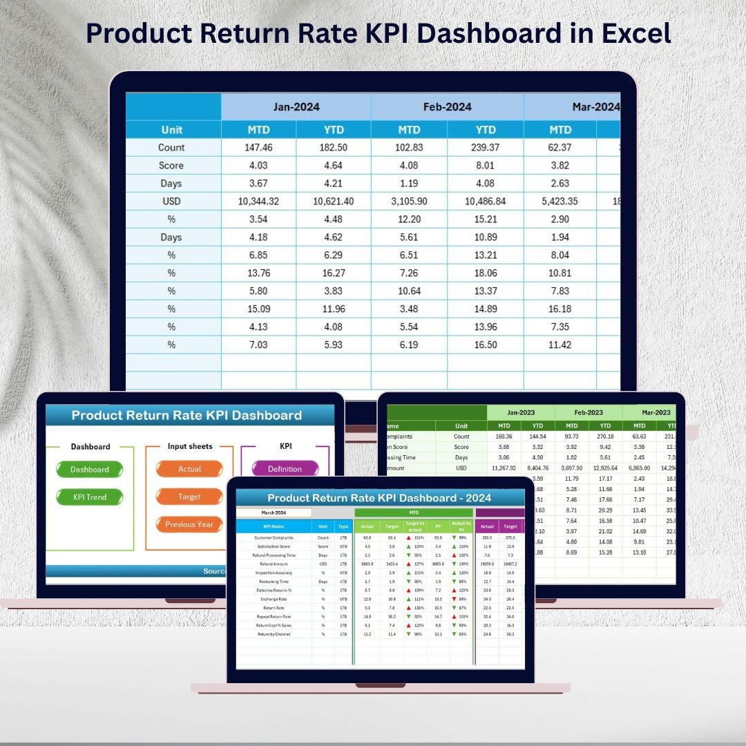 With seven dedicated sheets, the dashboard helps you manage actuals, targets, and historical comparisons seamlessly. From month-to-date (MTD) to year-to-date (YTD) tracking, you can evaluate return rates, analyze trends, and measure performance against targets—all within a single Excel file.