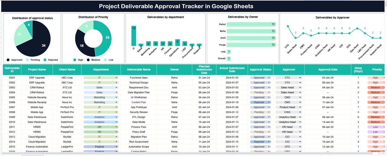This ready-to-use tracker provides a structured and centralized way to manage all project deliverable approvals in one place. Instead of chasing approvals manually, teams gain complete visibility into approval status, priorities, owners, approvers, and departments—supported by visual charts and a powerful search feature.Project Deliverable Approval Tracker in Google Sheets
