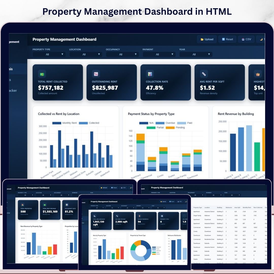 Property Management Dashboard in HTML is a powerful, interactive, and professionally designed browser-based dashboard template built for property managers, landlords, real estate investors, and facilities operations teams who need to track rent revenue, occupancy, tenant satisfaction, maintenance costs, and property performance — all from a single unified HTML dashboard. This template includes 5 interactive dashboard pages covering an overview, financial analysis, property insights, maintenance tracking, and a detailed data view — making it one of the most comprehensive HTML-based property management analytics solutions available today.