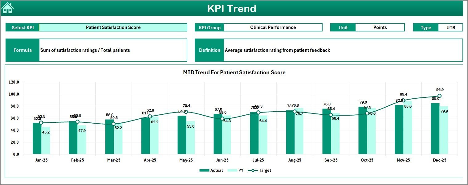 Delve deeper into trends with the KPI Trend sheet, where you can select individual KPIs to view detailed groupings, measurement units, KPI types (Lower the Better or Upper the Better), formulas, and definitions. Visualize MTD and YTD trend charts for actual, target, and previous year values to identify patterns and areas for improvement.