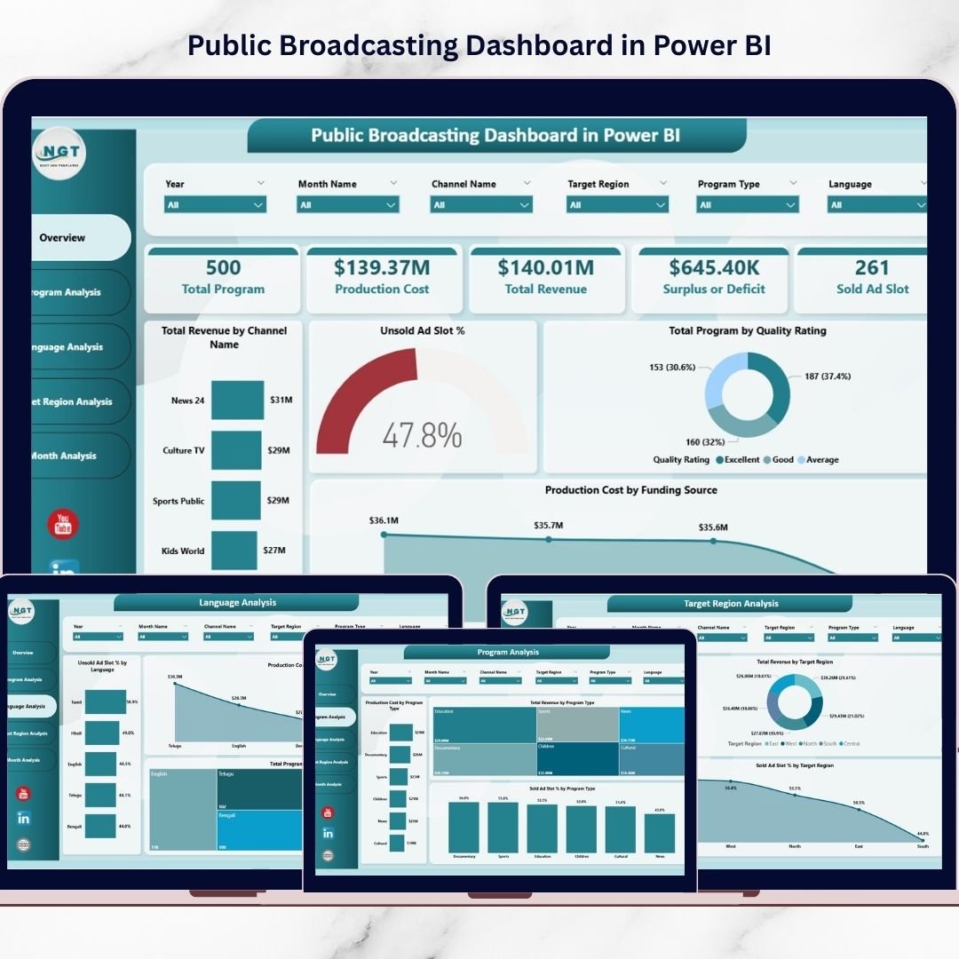 Whether you manage a public broadcasting network, television station, media organization, or advertising operations, this dashboard provides a structured platform to track and analyze broadcasting performance.