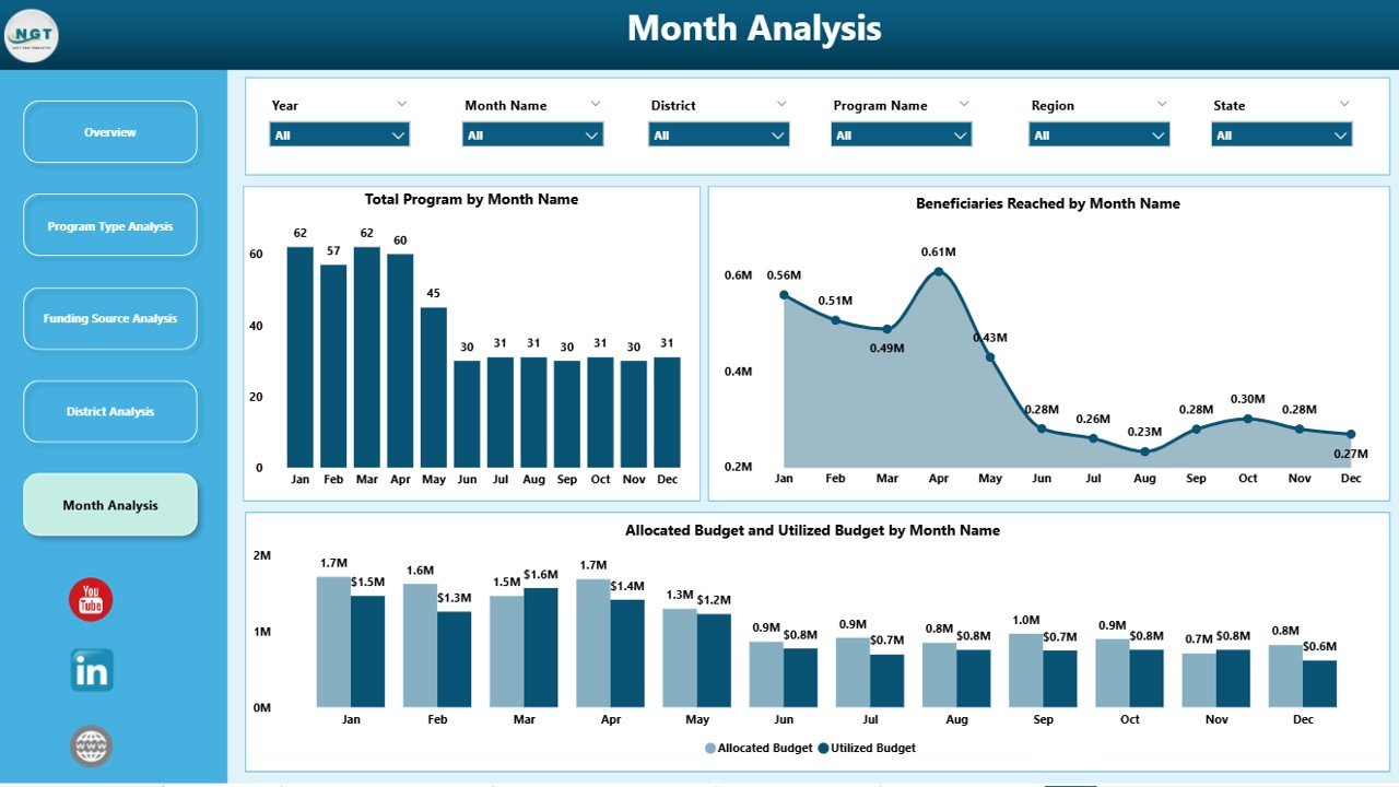 📅 Monthly Trends Page – Track Beneficiaries Targeted, Total Programs, and Budget Utilization by Month to understand progress over time.