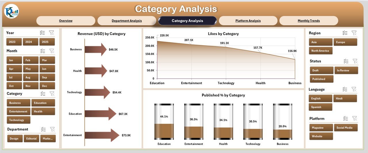 Analyze how various content types perform with visuals like Revenue (USD) by Category, Likes by Category, and Published % by Category.
