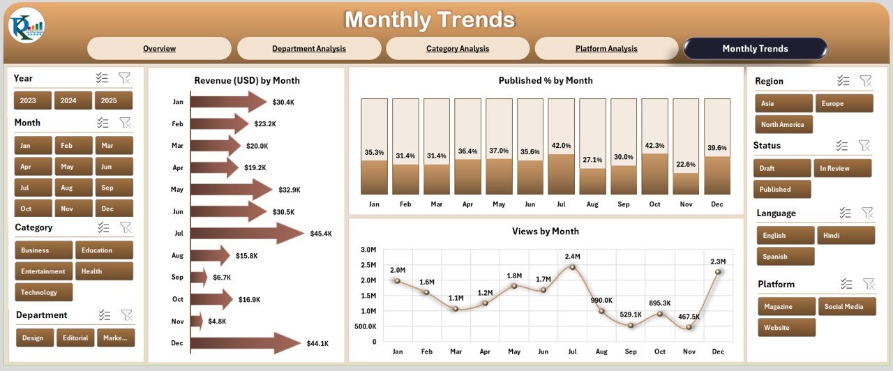 Discover seasonal performance with visuals like Revenue by Month, Published % by Month, and Views by Month. Spot high-performing periods instantly.