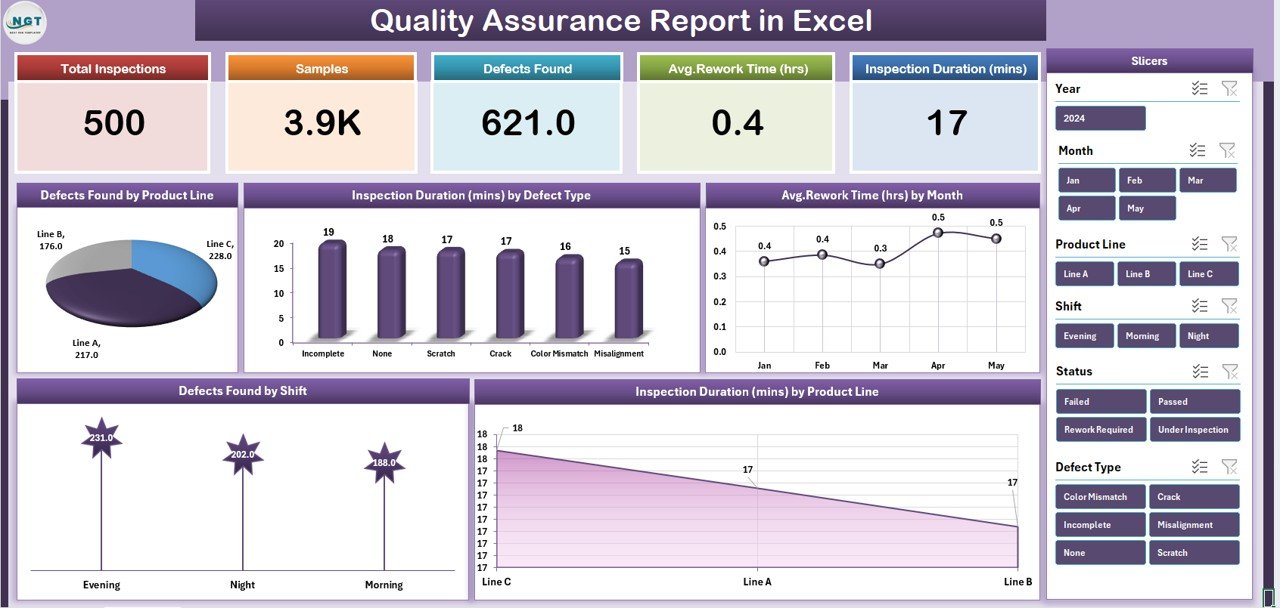 This ready-to-use Excel template centralizes all quality-related data into one structured, interactive system. With dynamic charts, slicers, and KPI cards, it helps managers, supervisors, and QA teams quickly analyze performance trends, track defects, and monitor inspection times. Instead of spending hours compiling data, you’ll have real-time insights at your fingertips.
