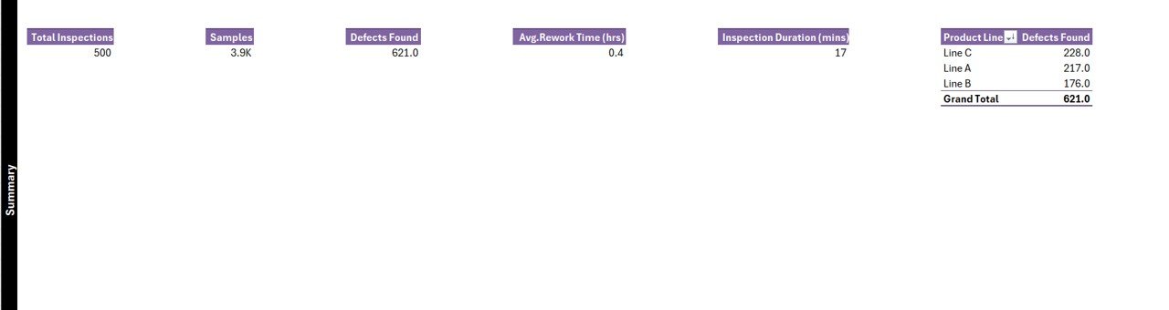 📂 Data Sheet – Stores raw QA data such as defect types, inspection durations, product lines, and rework time in a clean, structured format.