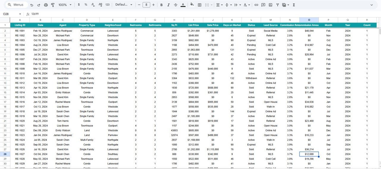 Financial Page🔍 Search Sheet — Pick a Listing ID from the dropdown and instantly view all details including Date, Agent, Property Type, Neighborhood, Bedrooms, Bathrooms, Sq Ft, List Price, Sale Price, Days on Market, Status, Lead Source, and Commission Rate.