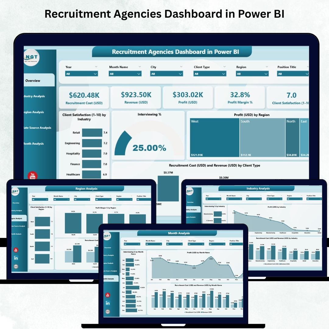 Recruitment agencies operate in a fast-paced environment where client expectations, candidate pipelines, interview performance, and hiring timelines change every single day. Because of this dynamic nature, recruitment teams need a clear, visual, and real-time reporting system that helps them track performance and make smart decisions instantly. The Recruitment Agencies Dashboard in Power BI delivers exactly that. It transforms raw recruitment data into clean, interactive visuals so agencies can monitor interviewing %, profit, cost, client satisfaction, candidate source performance, and monthly trends—all in one place. 🚀