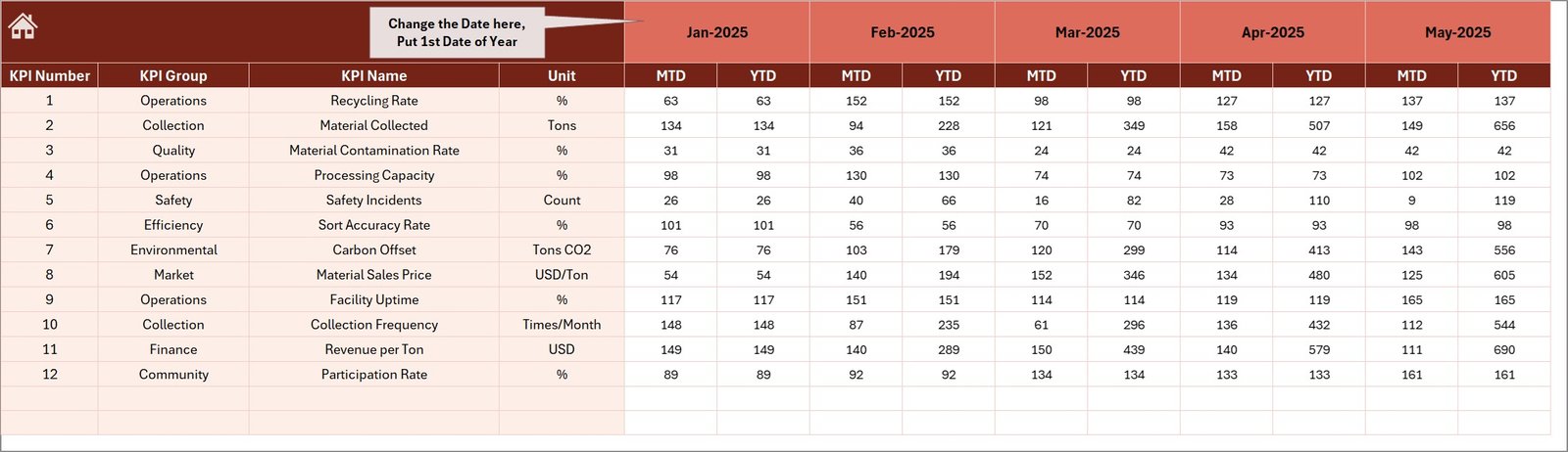 📅 Monthly KPI Monitoring – Analyze recycling performance for each month.