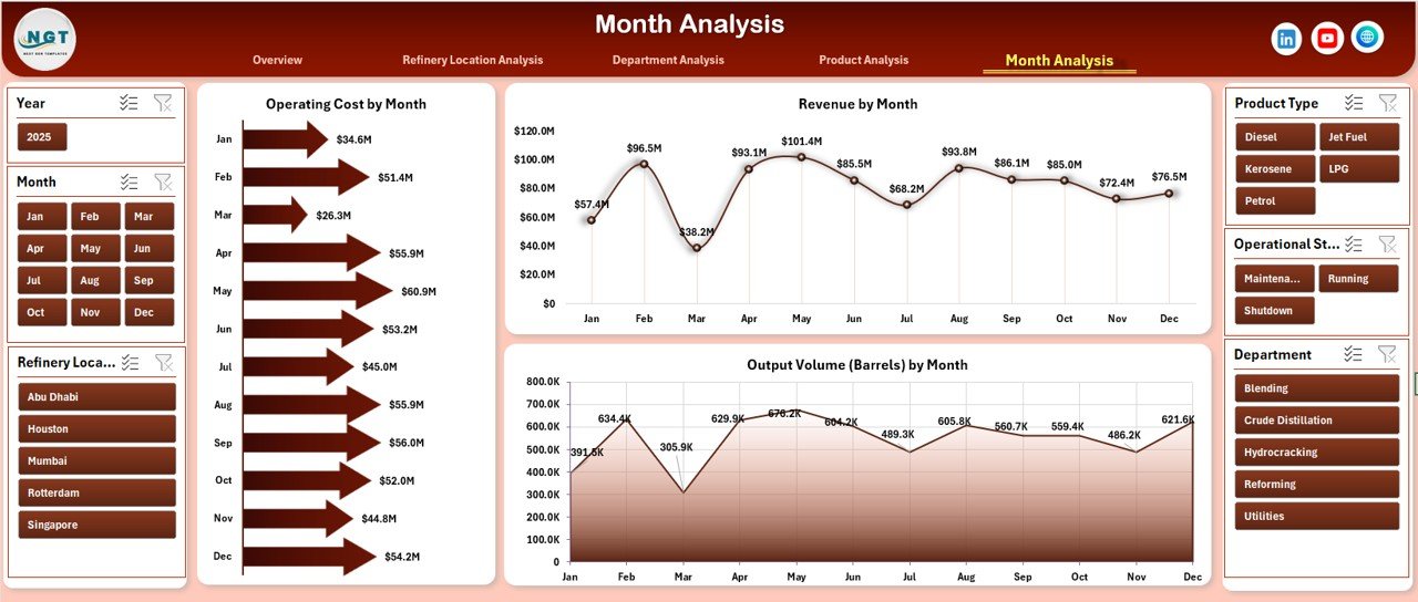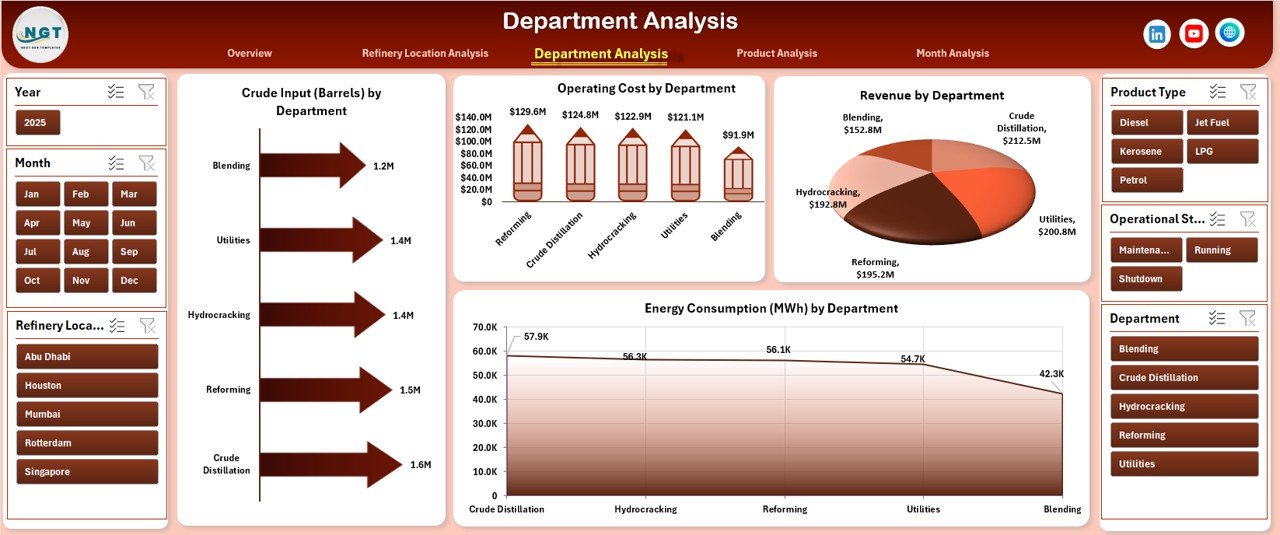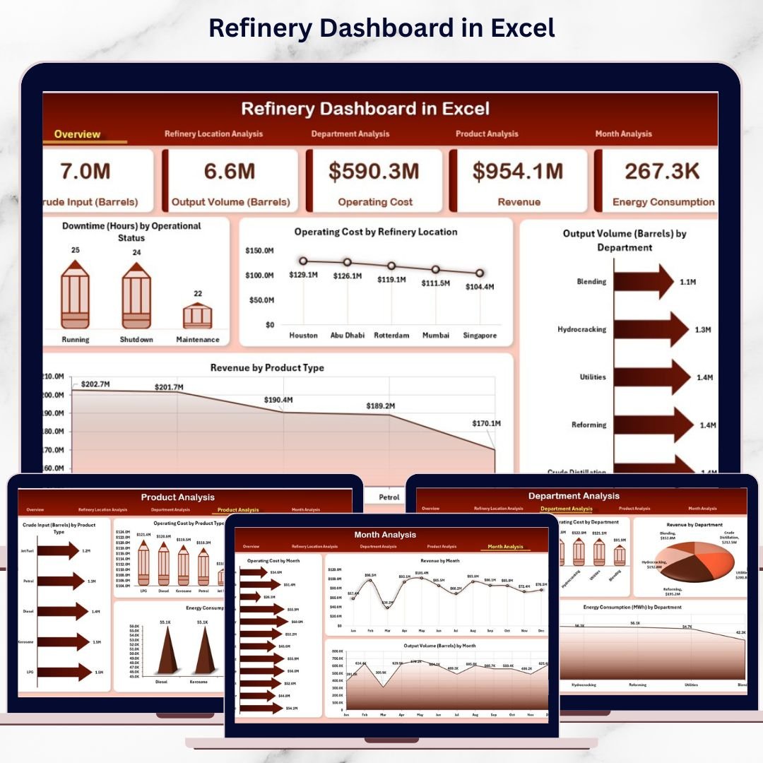 This ready-to-use Excel dashboard transforms raw refinery data into clear KPIs, interactive charts, and actionable insights. Instead of spending hours consolidating reports, refinery managers gain instant visibility into operations, costs, output, revenue, and energy usage—all from a single Excel file.