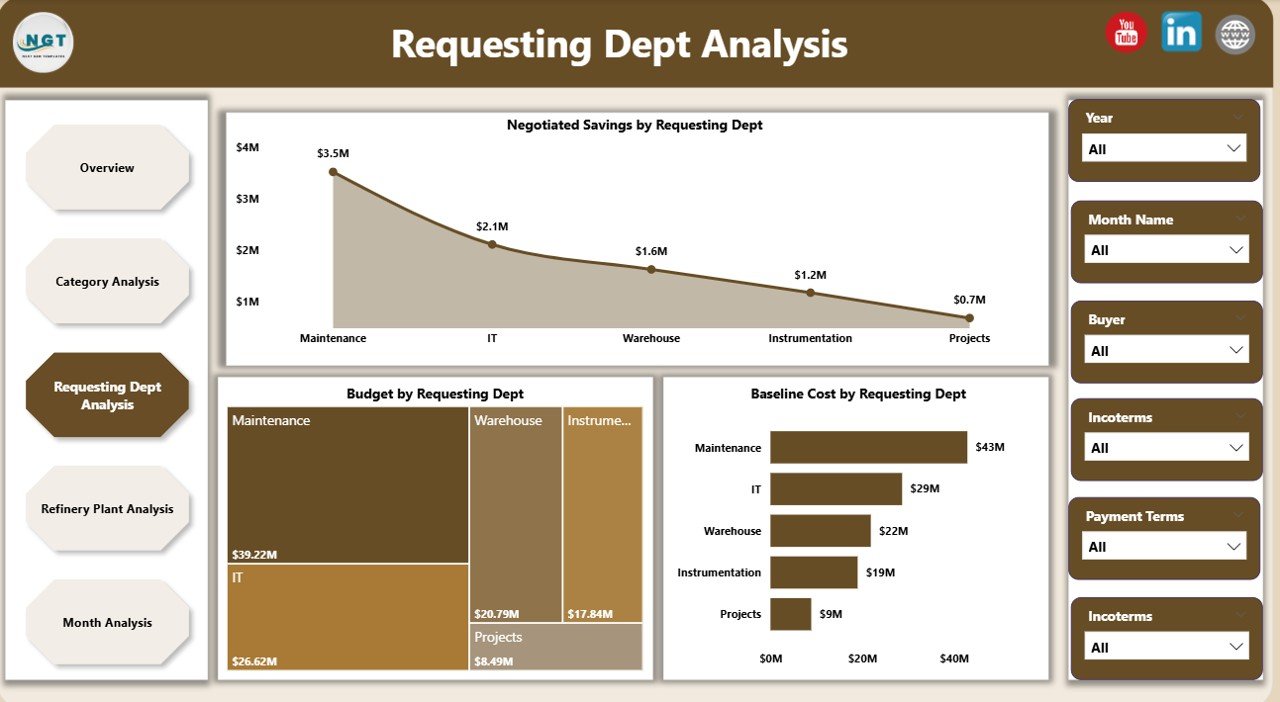 This professionally designed Power BI dashboard transforms complex purchasing data into interactive KPIs, visual insights, and real-time performance indicators. As a result, refinery procurement teams gain better control over budgets, baseline costs, negotiated savings, and high-priority purchases — all from a single centralized dashboard.