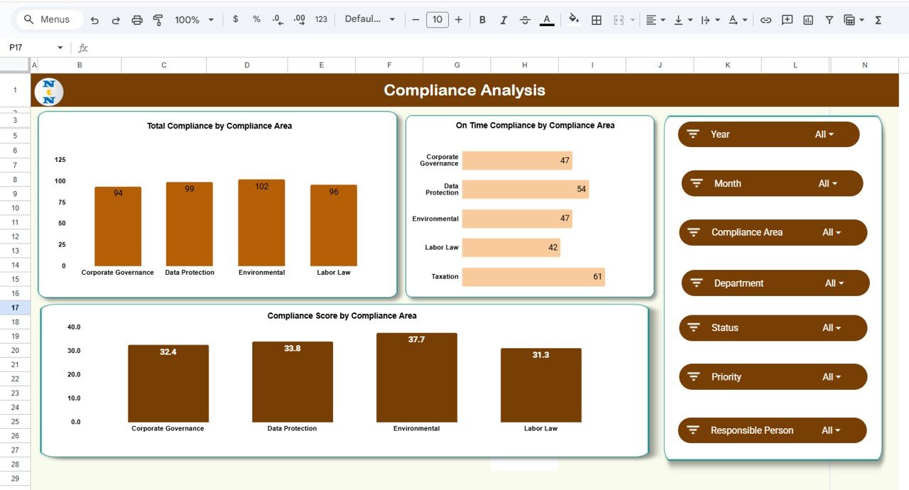 This ready-to-use dashboard helps organizations track all compliance requirements in one place. It provides real-time visibility into compliance status, urgency levels, departmental performance, and monthly trends. Because the dashboard is built entirely in Google Sheets, it is easy to maintain, highly collaborative, and accessible from anywhere—without investing in expensive compliance software.