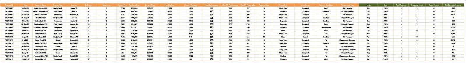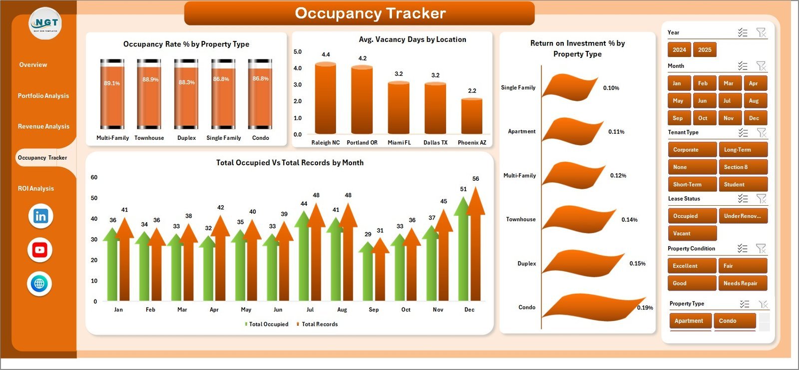 Yes. The dashboard includes multiple slicers that let you filter by Property Type, Location, Bedrooms, Management Type, Tenant Type, Lease Status, and Property Condition for focused analysis.