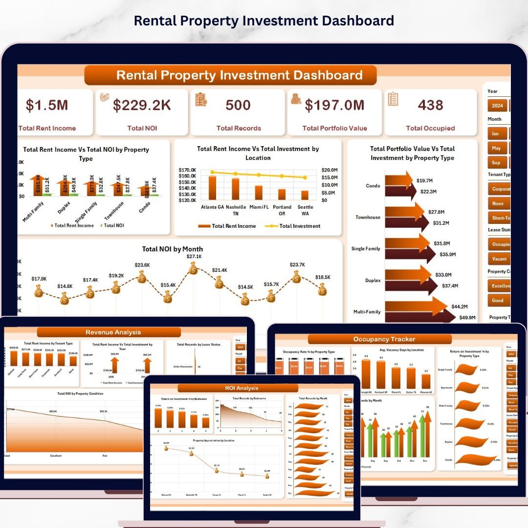 Rental Property Investment Dashboard in Excel is a comprehensive, data-driven analytics template designed for real estate investors, property managers, landlords, and financial analysts who want to monitor rental income, occupancy rates, ROI performance, and portfolio value — all in one powerful Excel dashboard. This template includes 5 interactive dashboard pages, a structured data sheet, and a support sheet with pivot tables that drive the entire dashboard dynamically 🚀.