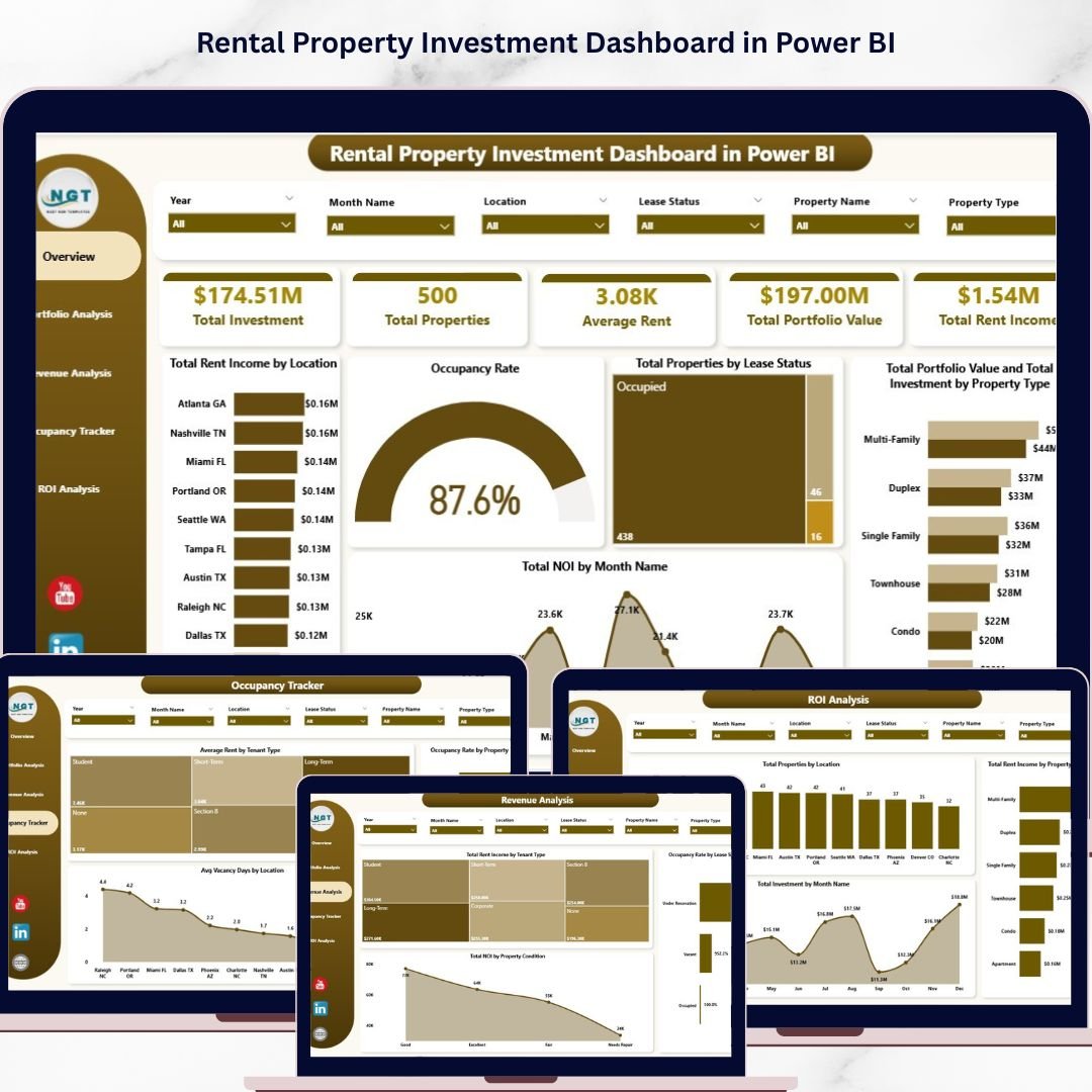 The Rental Property Investment Dashboard in Power BI from NextGenTemplates is one of the best options available. It includes 5 interactive pages covering portfolio analysis, revenue tracking, occupancy monitoring, and ROI analysis — all in a professionally designed, ready-to-use template.