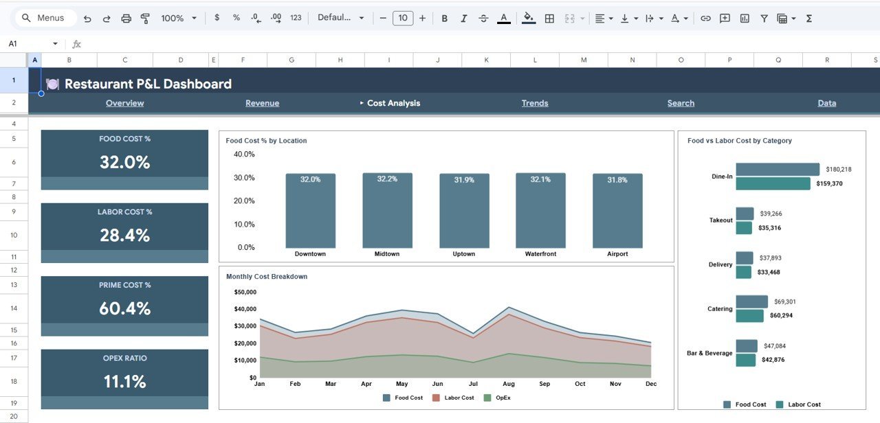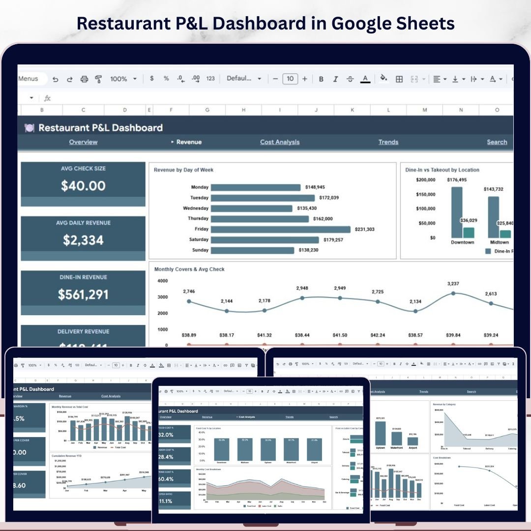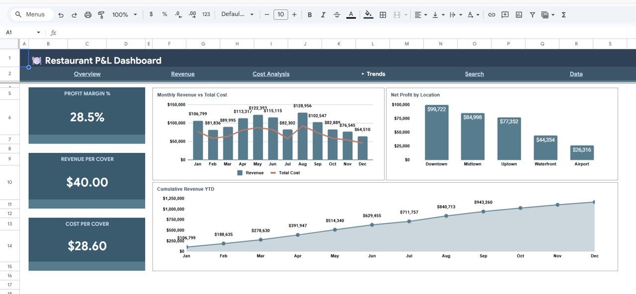 Restaurant P&L Dashboard in Google Sheets is a professionally designed, interactive analytics template built for restaurant owners, food service managers, hospitality finance teams, and F&B consultants who need to monitor total revenue, food cost, labor cost, gross profit, operating expenses, and covers across multiple restaurant locations — all from one powerful Google Sheets dashboard that works on any device. This template includes 6 interactive sheet tabs covering Overview, Revenue, Cost Analysis, Trends, Search, and Data, making it one of the most comprehensive Google Sheets Dashboard Templates available for the restaurant industry.