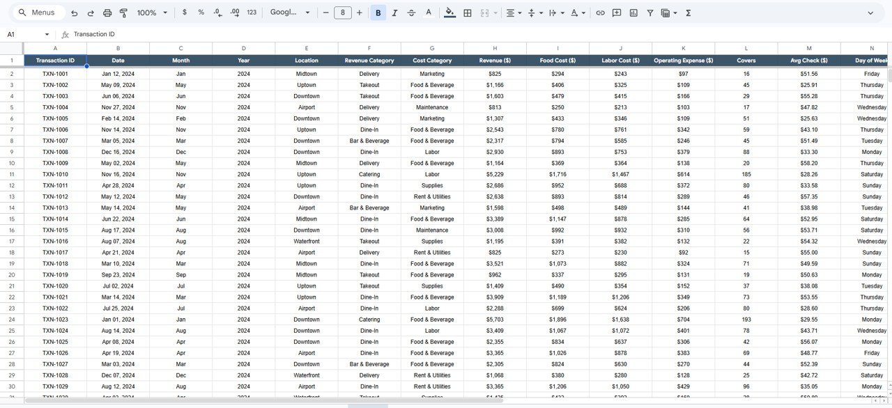 2️⃣ Navigate to the Data sheet tab and replace the sample data with your restaurant’s actual transaction records including date, location, revenue category, revenue, food cost, labor cost, operating expense, and covers.