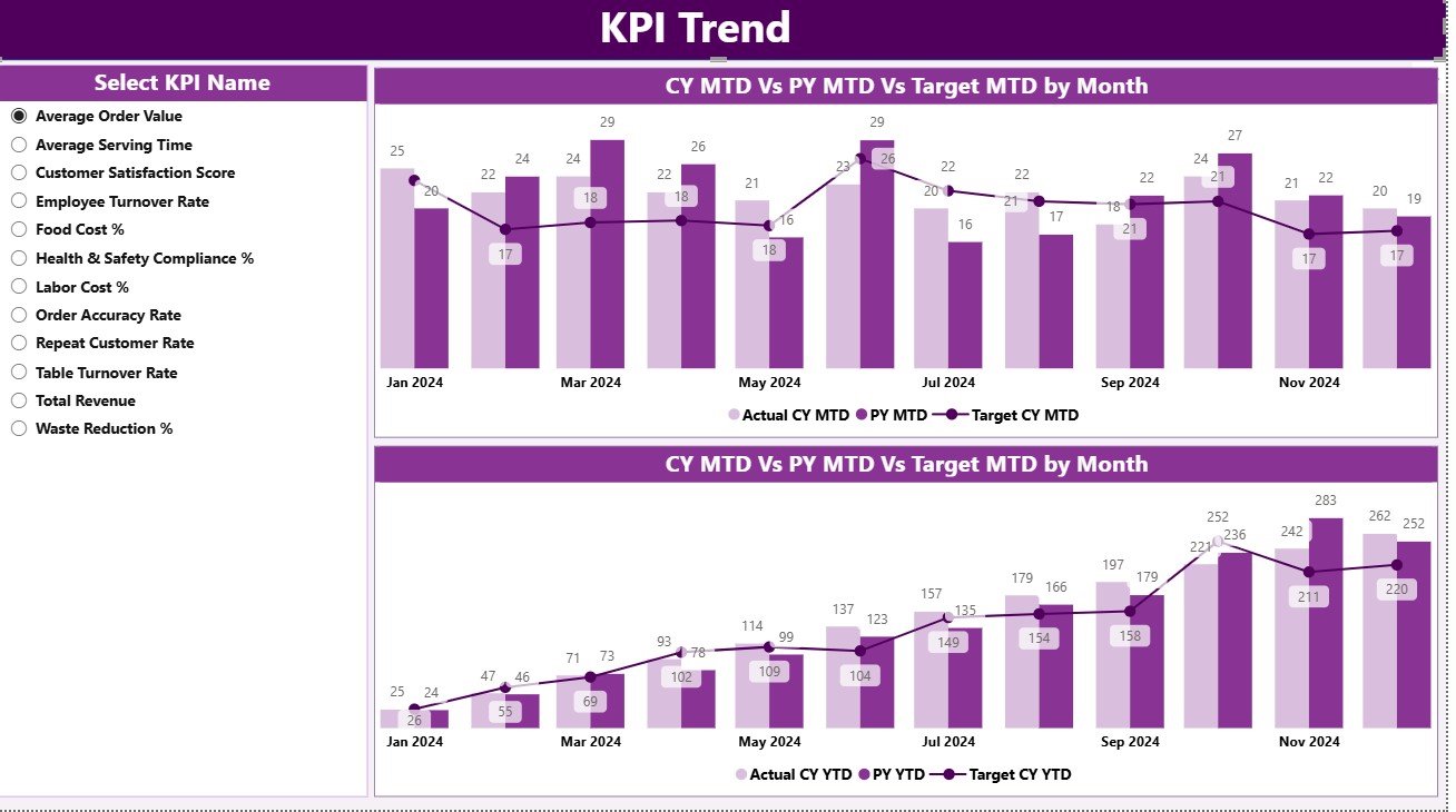 ⚙️ Operational KPIs – Table Turnover Rate, Inventory Turnover Ratio, Order Accuracy %, Food Waste %.