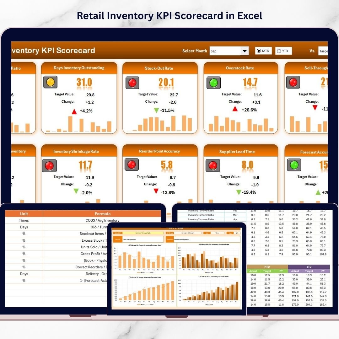 This dynamic Excel scorecard centralizes your key retail inventory metrics and allows you to compare Actual vs Target, analyze Month-to-Date (MTD) and Year-to-Date (YTD) performance, and review previous year benchmarks — all in one powerful dashboard.