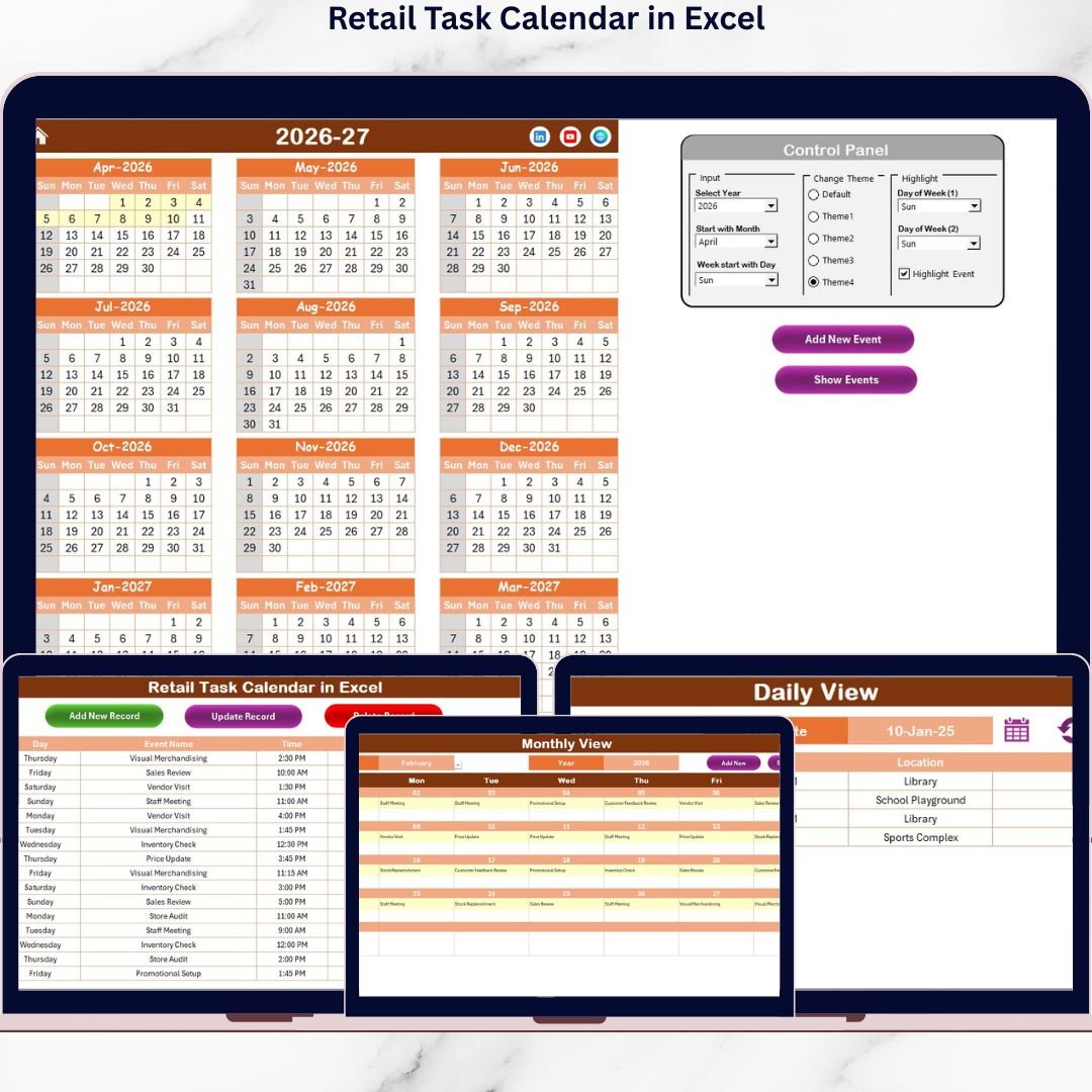 This ready-to-use Excel calendar helps retail teams plan, schedule, and track tasks and events across annual, monthly, and daily views—all from one centralized workbook. Instead of juggling multiple planning tools, managers get full visibility into retail operations with clear timelines, structured event data, and visual highlights. As a result, teams execute tasks on time and stay aligned throughout the year.