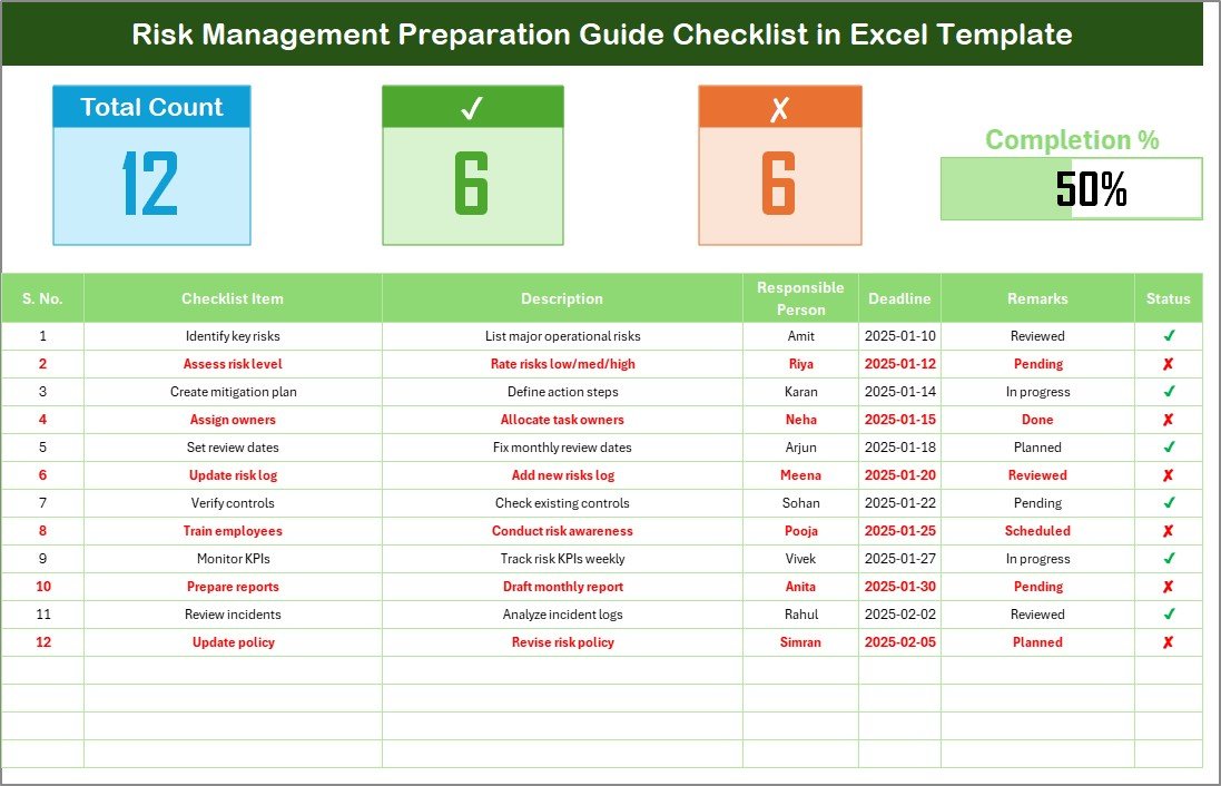 Mark ✔ for completed tasks and ✘ for pending ones. The progress bar updates automatically to reflect real-time progress.Risk Management Preparation Guide Checklist in Excel
